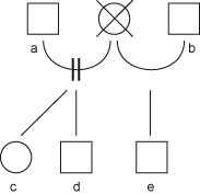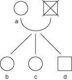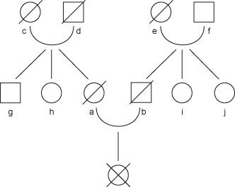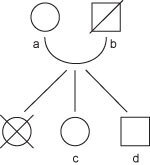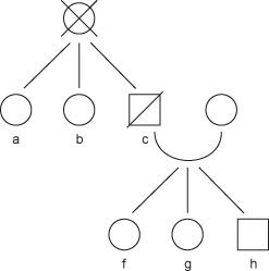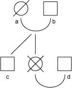 Vorbemerkung: Weibliche Personen werden mit einem Viereck und männliche Personen mit einem Kreis gekennzeichnet. Ehepartner sind mit einem Halbkreis miteinander verbunden. Bei geschiedenen Ehepartnern ist die Verbindung (Halbkreis) durchgestrichen. Die Erblasserin oder der Erblasser ist immer kreuzweise durchgestrichen. Bereits vor der Erblasserin oder dem Erblasser verstorbene Personen sind einfach durchgestrichen.